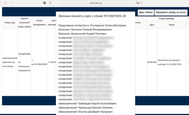 Рассмотрение началось в августе 2025 года. Обвиняемые - граждане Украины Георгий Тамбовцев (заместитель начальника «Департамента молодежи и спорта Херсонской области» под оккупацией) и Евгения Чернышова (назначенная оккупантами «ректор Херсонского государственного аграрно-экономического университета»), а также гражданин РФ Джабраил Юсупов (командир отделения 205-й отдельной мотострелковой казацкой бригады вооруженных сил РФ). Дело касается похищения и депортации 15 детей-сирот из Новопетровской специальной школы Снигиревского района Николаевской области в РФ.