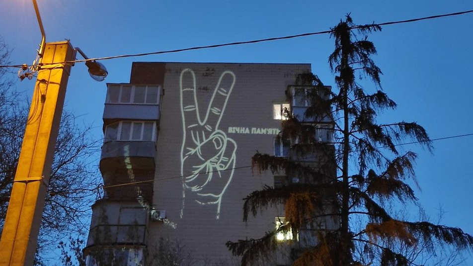Кроме того, жест "Виктори" также был на стене одного из домов у "Металлиста" в виде световой проекции.