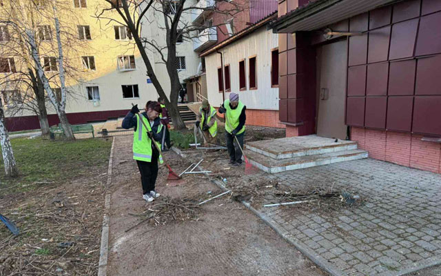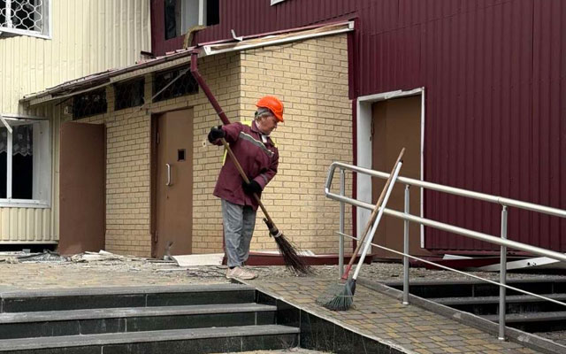 Коммунальщики убирают разбитое стекло, крупногабаритный мусор и приводят в порядок прилегающую территорию.