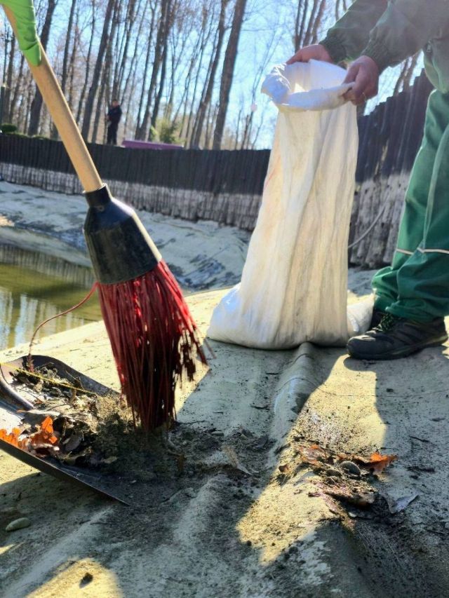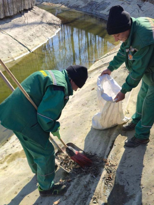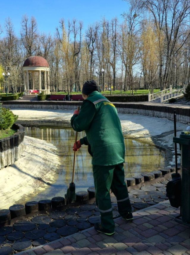 Коммунальщики убирают прошлогодние листья и мусор из чаши водоема.