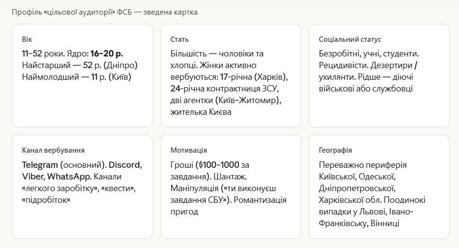 Вывод. Портрет «идеального исполнителя» для ФСБ — это молодой или несовершеннолетний человек (16–20 лет), безработный или испытывающий финансовые трудности, активный в Telegram, с периферии крупных областных центров. Пол и возраст являются второстепенными факторами: спецслужба РФ сознательно ориентируется на социальную уязвимость, а не на конкретный демографический профиль.