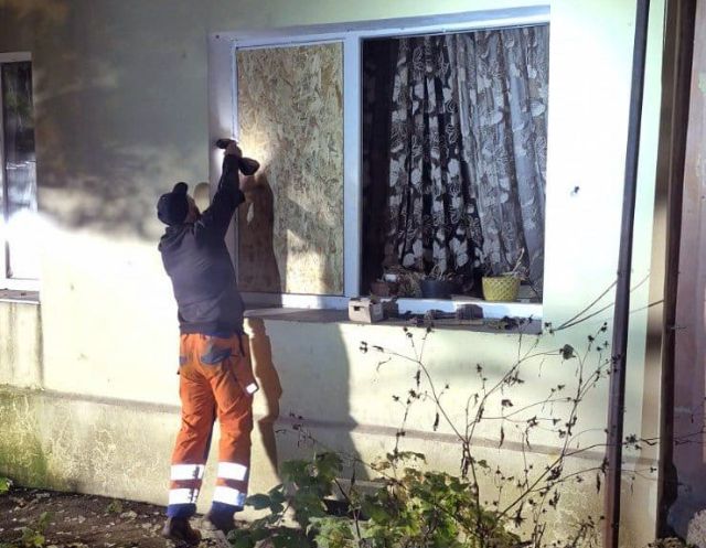 Специалисты КП «Харьковспецстрой» продолжают закрывать выбитые окна и помогают жителям устранить последствия атаки.