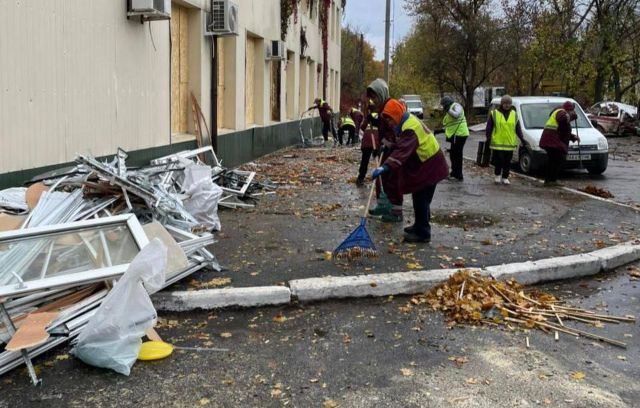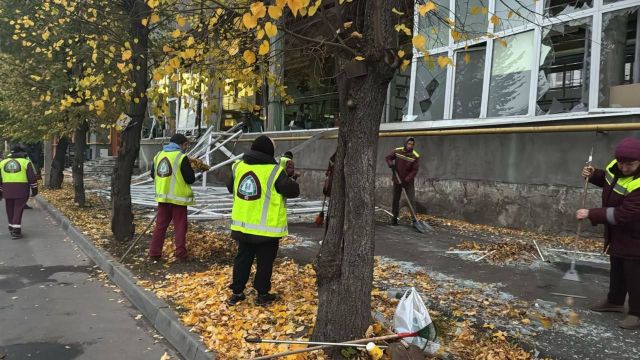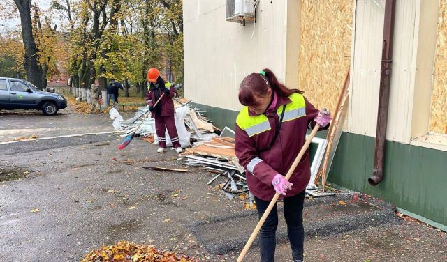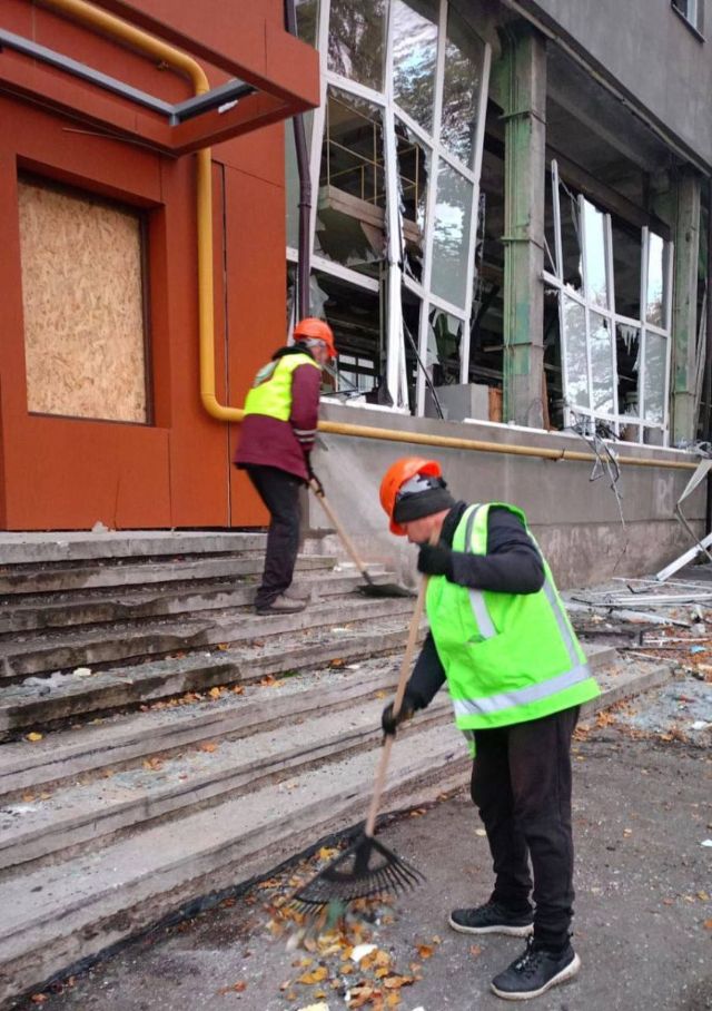 В Харькове убирают после обстрела вечером 13 октября. По данным горсовета, в Салтовском районе коммунальщики очищают территорию от стекла, обломков и габаритного мусора.
