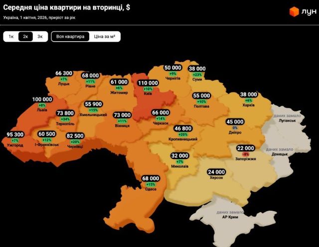 Средняя цена 2-комнатной квартиры в апреле в Харькове составляет 38 000 долларов. Рост цены за год составил 6%.