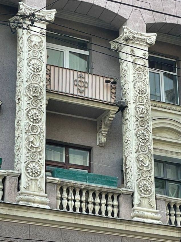 На пятиэтажном доме по ул. Сумская, 7-9, на колоннах размещалось изображение серпа и молота и пятиконечной звезды.