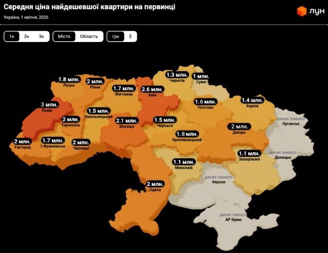Средняя цена наиболее дешевых 1-комнатных квартир в апреле в Харькове составляла 1,4 млн грн.