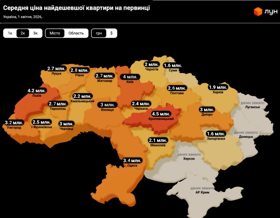 Средняя цена наиболее дешевых 2-комнатных квартир в апреле в Харькове составляла 1,9 млн грн.