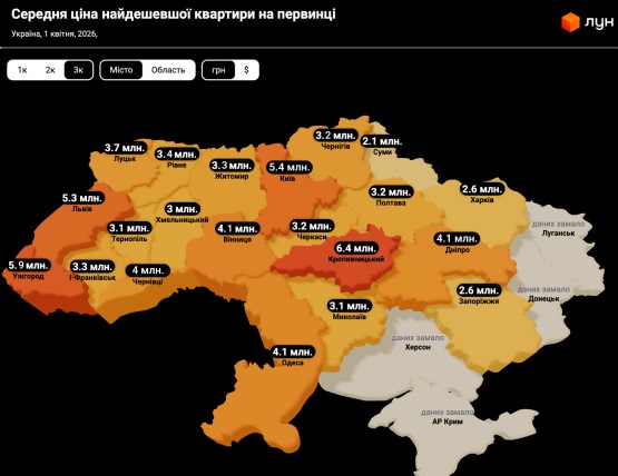 Средняя цена самых дешевых 3-комнатных квартир в апреле в Харькове составляла 2,6 млн грн.