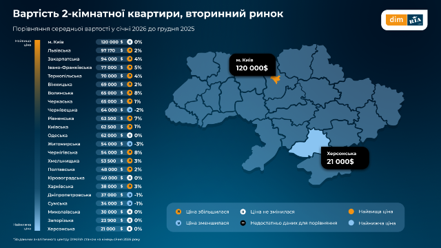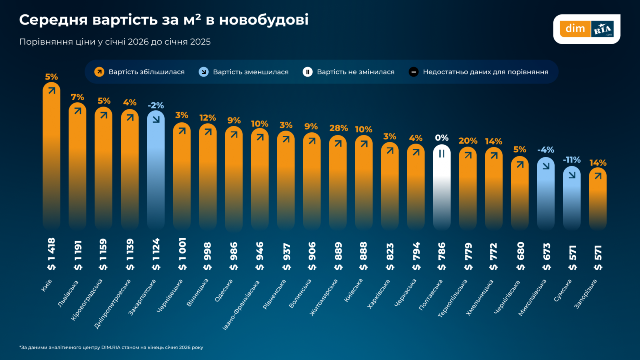 Житло у новобудовах у січні 2026 року у Харкові коштує 823 долари за квадратний метр. Порівняно із груднем 2025 року ціна впала на 3%. Попит на таке житло у регіоні зріс за місяць на 4%.
