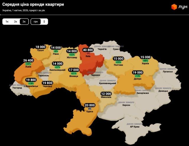 Оренда 3-кімнатної квартири у Харкові у квітні коштувала 15 000 грн. Зростання протягом року – 88%.