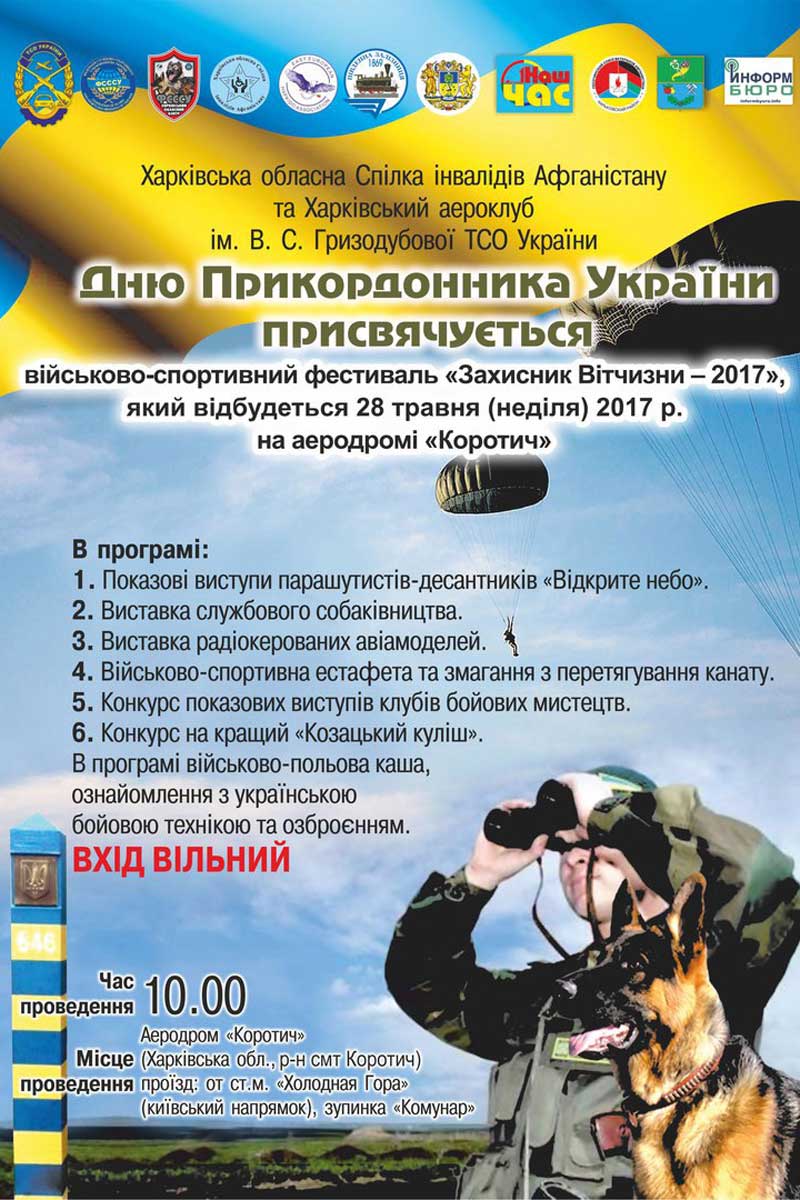 День пограничника отметят 28 мая (начало в 10.00) на аэродроме "Коротич". Об этом сообщили в харьковском аэроклубе им.Гризодубовой. Запланированы выступления служебных собак, выставка военной техники, показательные выступления парашютистов-десантников "Открытое небо". Гости мероприятия смогут участвовать в конкурсе по перетягиванию каната, сфотографироваться с собаками, будет угощение военно-полевой кашей.