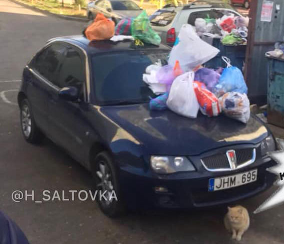 На Салтовке на крышу и капот легкового автомобиля наложили несколько пакетов с мусором. Очевидцы предположили, что эти действия связаны с тем, что машина припаркована с нарушением правил парковки.