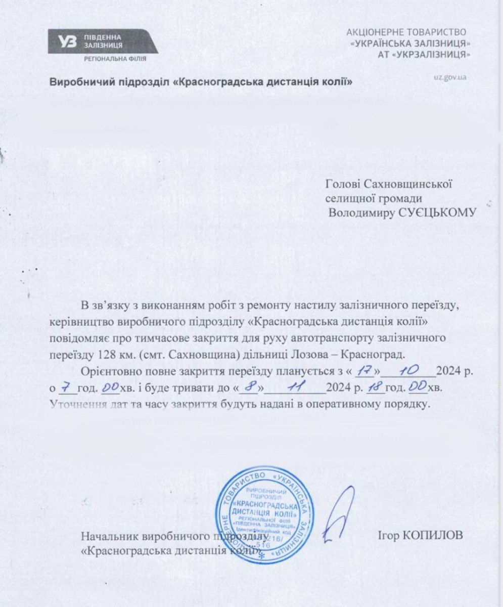 У Харківській області на 3 тижні закривають для автотранспорту залізничний переїзд у селищі Сахновщина, на дільниці Лозова-Берестин (колишній Красноград). Про це у Сахновщинській громаді.