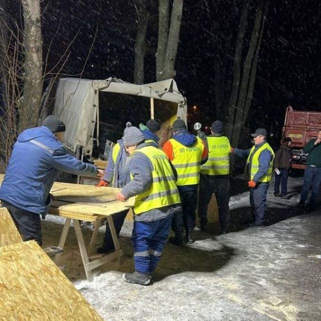 Фахівці підприємств «Харківжитлобуд» і «Харківське ремонтно-будівельне підприємство» усувають наслідки вибуху, закривають вибиті контури будинків.